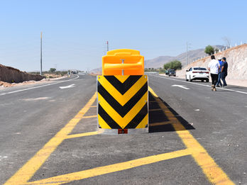 Amortiguador de impacto portátil; gracias a sus módulos plegables hace más fácil su traslado e instalación. Está diseñado para resguardar el inicio y final de barreras metálicas o de concreto ya sea temporales o permanentes, absorbiendo la energía del impacto para proteger a los ocupantes del vehículo.
